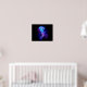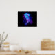 Large, blue, artistically drawn, glowing, bright jellyfish, with long tentacles on black background with purple bioluminescence. Luminous jellyfish.