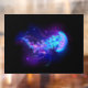 Large, blue, artistically drawn, glowing, bright jellyfish, with long tentacles on black background with purple bioluminescence. Luminous jellyfish.