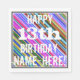 This fun birthday-themed paper napkin design features a message like "HAPPY 13th BIRTHDAY, NAME-HERE!", where the name can be customised. The background features a vibrant, multicolored stripes pattern. The message text is coloured white, and has a distressed appearance. Napkins like these could perhaps be used at a birthday party for somebody who is celebrating their thirteenth birthday. [~Z0000270]