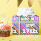 This fun birthday-themed wrapping paper design features a message like "HAPPY 17th BIRTHDAY, NAME-HERE!", where the name can be customised. The background features a vibrant, multicolored stripes pattern. The message text is coloured white, and has a distressed appearance. Wrapping paper like this could perhaps be used when wrapping gifts or presents being given to somebody who is celebrating their seventeenth birthday. [~Z0000272]