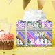 This fun birthday-themed wrapping paper design features a message like "HAPPY 24th BIRTHDAY, NAME-HERE!", where the name can be customised. The background features a vibrant, multicolored stripes pattern. The message text is coloured white, and has a distressed appearance. Wrapping paper like this could perhaps be used when wrapping gifts or presents being given to somebody who is celebrating their twenty fourth birthday. [~Z0000272]
