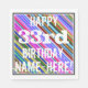 This fun birthday-themed paper napkin design features a message like "HAPPY 33rd BIRTHDAY, NAME-HERE!", where the name can be customised. The background features a vibrant, multicolored stripes pattern. The message text is coloured white, and has a distressed appearance. Napkins like these could perhaps be used at a birthday party for somebody who is celebrating their thirty third birthday. [~Z0000270]