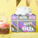 This fun birthday-themed wrapping paper design features a message like "HAPPY 6th BIRTHDAY, NAME-HERE!", where the name can be customised. The background features a vibrant, multicolored stripes pattern. The message text is coloured white, and has a distressed appearance. Wrapping paper like this could perhaps be used when wrapping gifts or presents being given to somebody who is celebrating their sixth birthday. [~Z0000272]