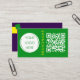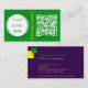 A sleak modern design with bold contrast colours of vibrant green, dark purple and yellow. Simple and modern. All the contact information you need: name, titel, social media, address, phone, website and e-mail. Classic business card but with a vibrant colour combination. Add your own logo and QR code.