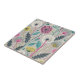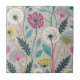 Eye-catching seamless pattern ceramic tile featuring stylised dandelion blooms in teal, white, and coral pink, paired with deep purple leaves and colourful stems on a solid grey background. This modern botanical design captures flowers in every stage of bloom, making it perfect for nature-inspired, whimsical, and seasonal spring or summer themes.