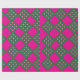 This gift wrapping paper features a vibrant green background accented with bright pink flowers, arranged in a beautiful geometric pattern between bold red stripes.