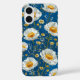 Vibrant floral pattern featuring large, white flowers with yellow centres. These blooms have a rich, textured appearance and stand out against a deep navy blue background. The arrangement includes various sizes of flowers, some fully open and others in bud form, surrounded by delicate green foliage and small, subtle wildflowers. The contrast of the bright white and yellow against the dark background creates a lively and striking visual effect, evoking a sense of freshness and natural beauty.