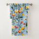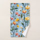 A colourful floral pattern featuring hand-painted flowers in warm tones of yellow, orange, red, and white against a soft blue background. The elegant botanical composition adds a fresh and artistic touch, perfect for textiles, wallpapers, and design projects.