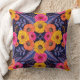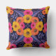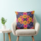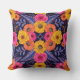 This square throw pillow has flowers and leaves in saturated shades of yellow, orange, purple, and hot pink surrounded by red outlines.
