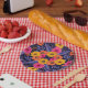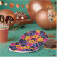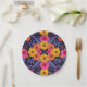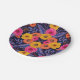These paper plates feature flowers and leaves in saturated shades of yellow, orange, purple, and hot pink surrounded by red outlines.