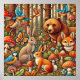 A lively forest illustration showcasing various animals like a fox and bear, birds, mushrooms, and floral elements in a dynamic composition.