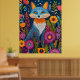 Discover a stunning piece of dot art featuring a vibrant blue fox with orange accents, surrounded by a lush, colorful garden of fantastical flowers and foliage. This whimsical illustration brings a touch of nature and fantasy.