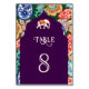 Elegant wedding table number featuring a beautiful arch and colourful artwork.
