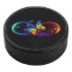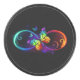 Vibrant infinity with rainbow butterfly on black hockey puck