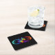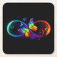Vibrant infinity with rainbow butterfly on black square paper coaster