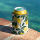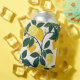 The pattern features a lively and vibrant design with lush lemon trees. The branches are adorned with ripe, bright yellow lemons, some of which are sliced open to reveal their juicy interiors. The lemons are surrounded by deep green leaves, which contrast beautifully with the warm, cream-coloured background. The overall style is bold and stylised, with clean lines and a sense of symmetry, creating a fresh and cheerful aesthetic that evokes a Mediterranean vibe.