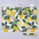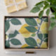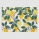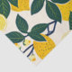 The pattern features a lively and vibrant design with lush lemon trees. The branches are adorned with ripe, bright yellow lemons, some of which are sliced open to reveal their juicy interiors. The lemons are surrounded by deep green leaves, which contrast beautifully with the warm, cream-coloured background. The overall style is bold and stylised, with clean lines and a sense of symmetry, creating a fresh and cheerful aesthetic that evokes a Mediterranean vibe.