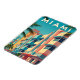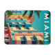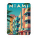 Colourful illustration of iconic Miami architecture featuring geometric patterns, pastel colours, and lush palm fronds casting shadows.