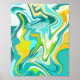 This design contains an abstract pattern with flowing, wave-like shapes in bright shades of turquoise, teal, yellow, and green. The composition suggests a sense of movement and energy, evoking natural elements like ocean waves or flowing water.