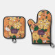 Elevate your baking experience with this eye-catching oven mitt and pot holder set. The design showcases a vibrant pattern of bold yellow flowers and green foliage set against a warm orange backdrop, with hints of purple adding depth and contrast. This graphic design evokes a sense of joyful, retro botanical art, making it a beautiful addition to any kitchen. Protect your hands in style and add a lively botanical touch to your culinary adventures.