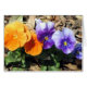 Vibrant orange and blue violet pansies bloom in springtime through fallen autumn leaves.