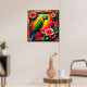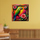 Colourful parrot with vivid plumage sits on a branch, accompanied by bright tropical flowers against a serene blue background, creating a vibrant and lively tropical theme.