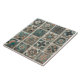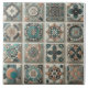 A stunning array of ceramic tiles features an intricate design in various colours, including teal, beige, and black. Each tile displays unique patterns, adding a sense of artistry and texture to any space.