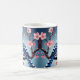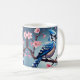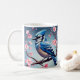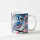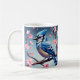 A stunning blue jay sits proudly on a delicate cherry tree branch, surrounded by lush green leaves and vibrant pink blossoms. The bird's brightest blue and white feathers contrast beautifully with the soft pink of the flowers, creating a visually striking scene. The intricate details and bold colours evoke a sense of joy and serenity, inviting the viewer to appreciate the beauty of nature.