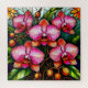 Colourful stained glass featuring blooming pink orchids with green foliage, showcasing a tropical, artistic design with intricate details and bright colours, embodying beauty, nature, and timeless elegance in artistic expression.