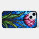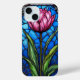 Beautifully crafted stained glass panel featuring a vibrant pink tulip against a bright blue background, highlighted with intricate details and elegant green leaves.