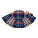 Colourful plaid pattern in blue, orange, beige.