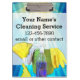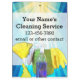 Personalise this colourful full-colour promotional business product with your cleaning or janitorial company name and details. Features aqua and bright blue rays of light background with a yellow gloved hand holding feather duster, a green bucket with rag, and blue spray solution.