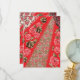 Vibrant red fabric featuring intricate floral and thank you card