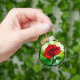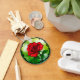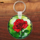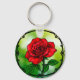 Vibrant red rose is centred within an ornate black frame, set against a soft green blurred background, creating a striking contrast that highlights the beauty of the flower.