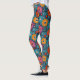 Bright orange, yellow, and purple flowers on a retro, mid-century modern background of teal squares, red-orange and pink dots, and white space-age stars create a fabulous pair of leggings.