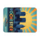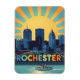 A stylised illustration of the Rochester, New York skyline bathed in the warm glow of a setting sun with a boat on the river.