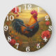Sunset farmhouse clock featuring a colourful rooster perched on wood, surrounded by red roses under golden twilight. White numerals on warm-toned backdrop create rustic charm—perfect for kitchen decor or farm lover gifts.