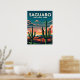 A stylised illustration of a desert sunset over Saguaro National Park, featuring prominent saguaro cacti and dramatic clouds.