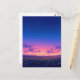 This ethereal postcard captures the magical transition between day and night over a sprawling countryside. The foreground is alive with a lush carpet of blue, purple, and yellow wildflowers nestled in deep green grass. As the eye moves toward the horizon, a brilliant pink and orange sunset glow warms the sky before deepening into a vast, star-studded indigo. Soft purple clouds drift across the center, adding depth to the celestial display. With its dreamlike atmosphere and high-contrast color palette, this piece evokes a sense of profound peace and natural wonder. This postcard is a beautiful choice for sending a hopeful message, a nature-inspired greeting, or as a serene decorative keepsake.