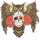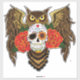 This bold sugar skull owl design blends Día de los Muertos symbolism with striking gothic style. A detailed brown owl with outstretched wings frames a decorative sugar skull adorned with colourful floral accents, a diamond motif, and vibrant red roses. Set against a rich orange background, this artwork captures a dramatic mix of wisdom, mystery, and romantic gothic beauty.