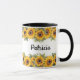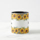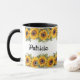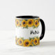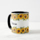 Personalised first name trendy modern sunflowers blooms two-tone mug on white background. This modern mug makes a perfect birthday gift or present for any special occasion. Custom the mug with a name for a unique touch, or as a treat yourself.
