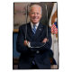 The photograph captures a moment in time before president elect Joe Biden appointed office of Vice President of the United States. Sunlight streams through a window, casting a warm glow on the figure of an Biden standing confidently in the center of the frame. His arms are crossed, a gesture that suggests both authority and a hint of casual ease. --- Mr. Biden is dressed impeccably in a dark suit, the crisp fabric contrasting sharply with the clean lines of his white shirt. A blue and white striped tie adds a touch of personality to the ensemble. --- A glimpse of patriotism is evident in the background. An American flag stands proudly on a pole to the man's right, its vibrant colors a subtle counterpoint to the cool blue of the wall behind him. A closer look reveals a painting hanging on the wall, adding a touch of personal flair to the professional atmosphere. --- Soon to be Vice President Biden is the focal point of the image. His short white hair frames a kind face, etched with the lines of a life well-lived. A warm smile plays on his lips, conveying a sense of confidence, wisdom, and perhaps a hint of amusement.