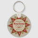 Round keychain with a Christmas greeting. The design is inspired by a beautiful Victorian Christmas star with 16 points and floral decorations. The colours are red, gold and beige.