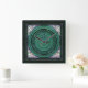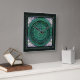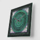 An ornately wooden framed baroque clock embellished with birds, flowers and plants. The clock is in the centre of the frame, has a metal look and is very detailed and decorative and done in green colour with blue numbers and a touch of purple.