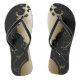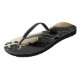 Black flip flops with a Victorian style gold metallic design. An elegant design.
