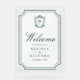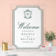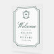 Elegant catholic wedding welcome sign featuring beautiful victorian crest with intricate details.