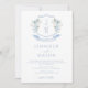 Immerse yourself in refined sophistication with this elegant Victorian French styled wedding invitation, featuring graceful illustrations of light blue and white flowers forming a wreaths on vintage crest with bride and groom mongram inside. A perfect choice to infuse charm into your spring or summer celebration, this invitation captures the essence of classic beauty.