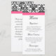 Elegant Magenta Fuchsia pink, black and white wedding menu rack card, with elegant floral damask accent, and coloured horizontal accent strip. Customise online with your wedding details. Elegant hot pink fuchsia magenta accent, and black and white damask pattern. Fresh, clean and elegant damask accent, and coloured horizontal accent strip.