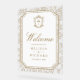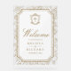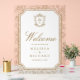 Elegant catholic wedding welcome sign featuring beautiful victorian crest with intricate details.