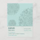 Vintage and modern meet to create a contemporary look on this lovely postcard. A classic Victorian ornament is used as a repeating graphic element against a soft aqua background. Your customizeable information is set off against a lighter panel to create an unforgettable save-the-date magnet. The back is left blank for your own personal message and addressing information. See my store for matching cards, postage and favours. Available in alternative colours.